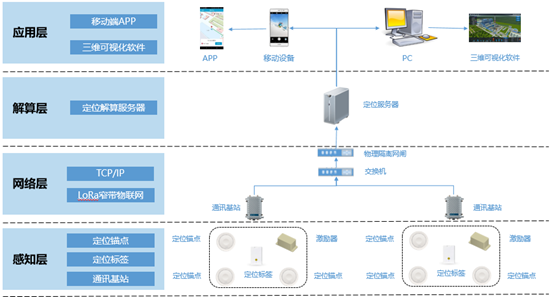 感知層:包括定位標簽、定位錨點、激勵器。定位標簽和定位錨點之間通過UWB信道實時測距,測距信息通過LoRa 2.4G無線網絡上傳到通訊基站。